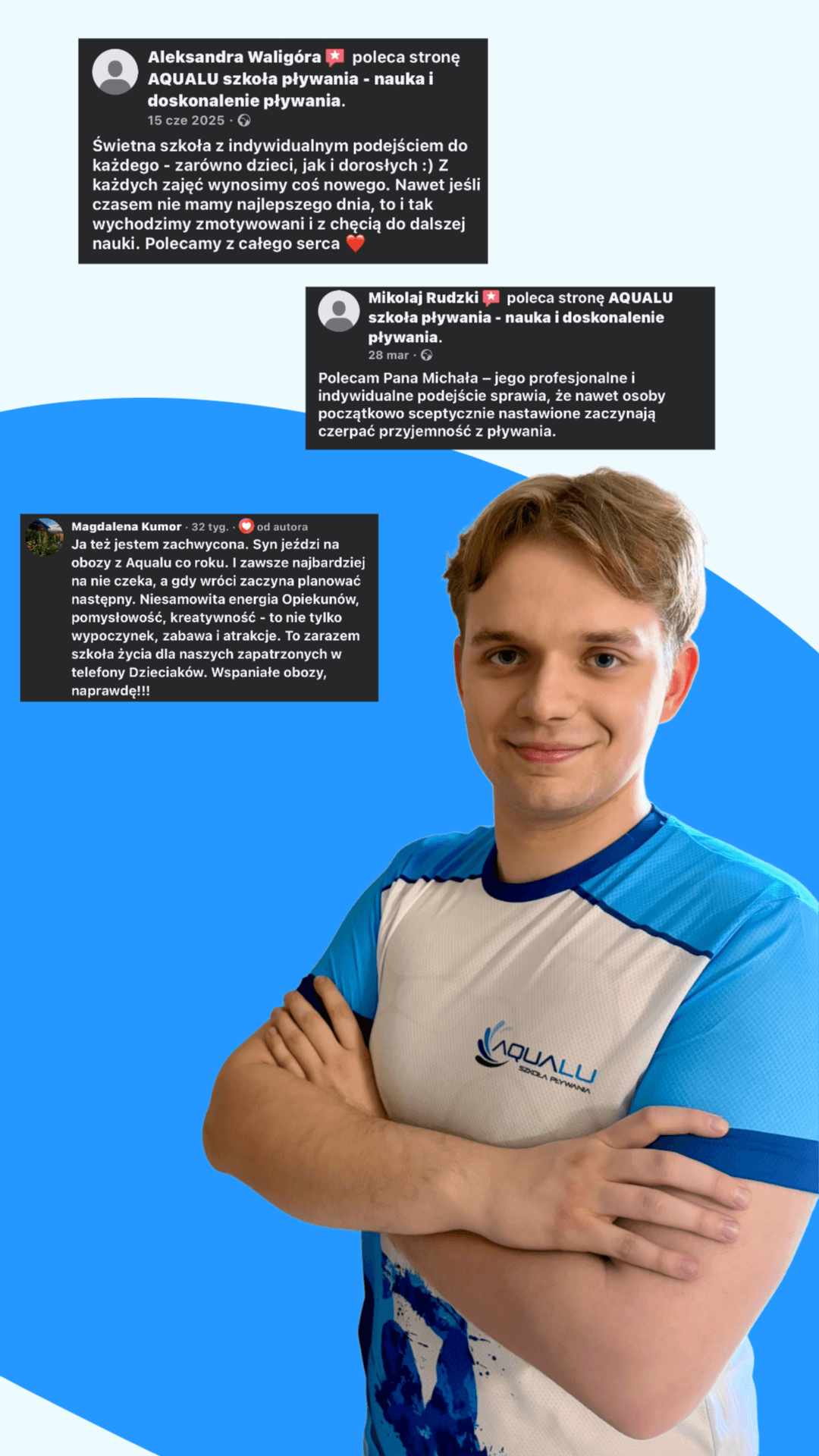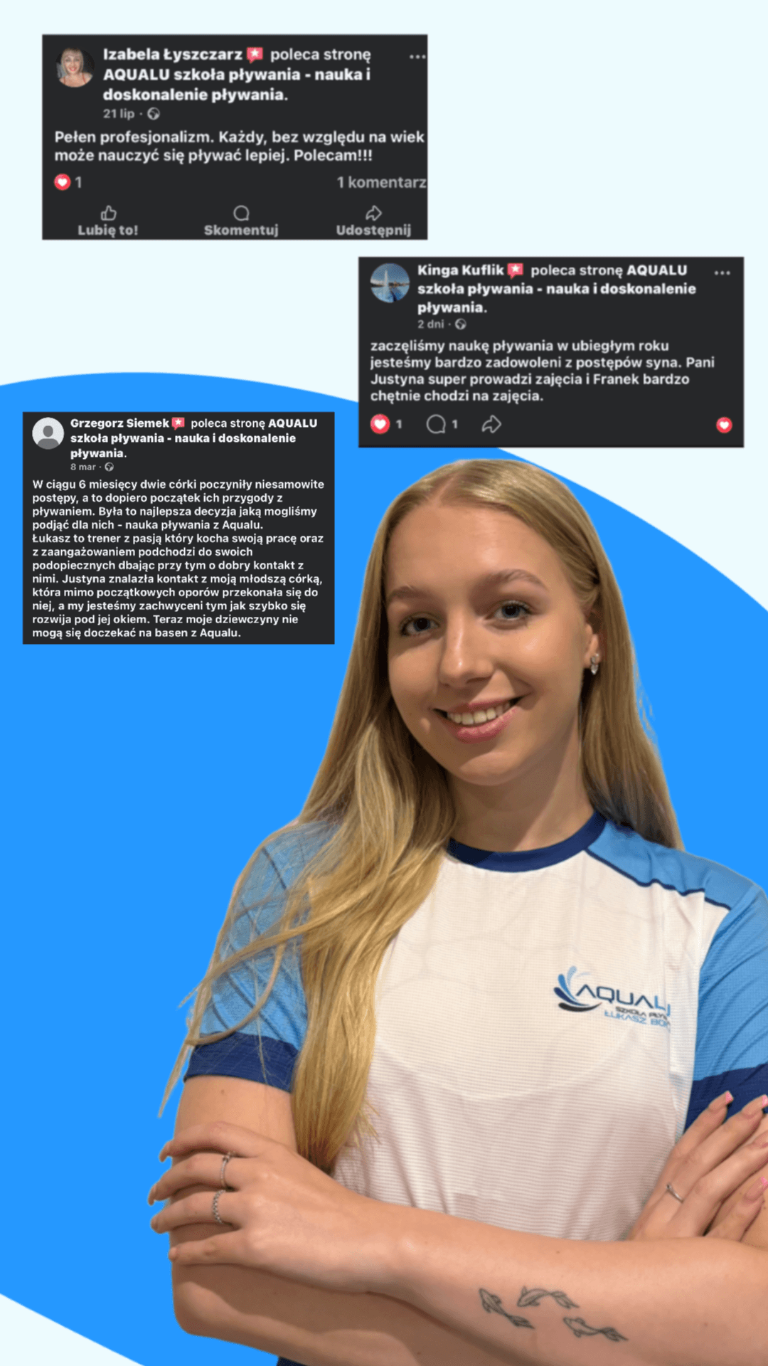 Nazywam się Łukasz Boryn jestem magistrem Wychowania Fizycznego oraz trenerem II klasy dyscypliny pływania z licencią PZP i gwarantuję Ci, że pływanie stanie się dla Ciebie nie tylko umiejętnością. Jestem założycielem szkoły pływania AQUALU oraz klubu pływackiego UKS AQUALU. Od niemal 19 lat uczę tej dyscypliny dzieci, młodzież i dorosłych. Niezależnie od tego, czy dopiero zaczynasz swoją przygodę z wodą, czy jesteś zaawansowanym pływakiem przygotowującym się do zawodów, pomogę Ci osiągnąć zamierzone cele i rozwinąć Twoje umiejętności.